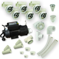 Jet system 1 includes a high-power water pump, 6 massage jets, air controller, suction and fittings, along with Y-joints, elbow, plugs, and connection hoses—offering a complete, pressure-balanced whirlpool solution.
